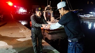 前日に船長の計らいで一番デカい太刀魚を釣った人にオ-シャンズTシャツを